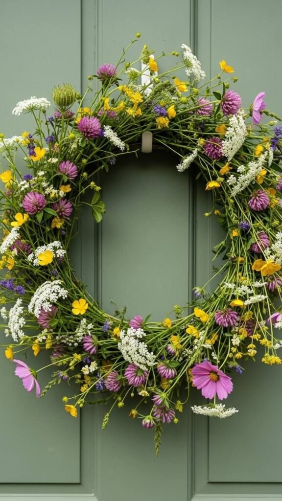 Capture the meadow vibe with mixed faux wildflowers. Arrange them loosely so stems show—stiff symmetry kills the wild look. Use 6-8 flower varieties in complementary colors. This carefree style costs $18-25 and feels romantic. Great for cottage or bohemian homes. Let some stems extend beyond the circle for movement.