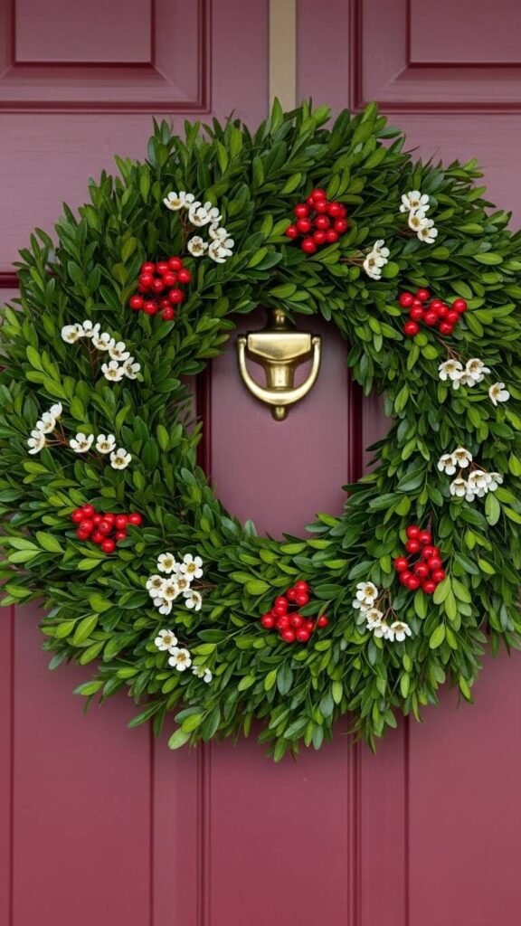 Boxwood stays green year-round but feels fresh in spring with berry accents. Buy a preserved boxwood base or make one from clippings. Add small berry clusters and white filler flowers. This traditional look costs $30-40 for quality boxwood but lasts years. Suits colonial or traditional homes perfectly.