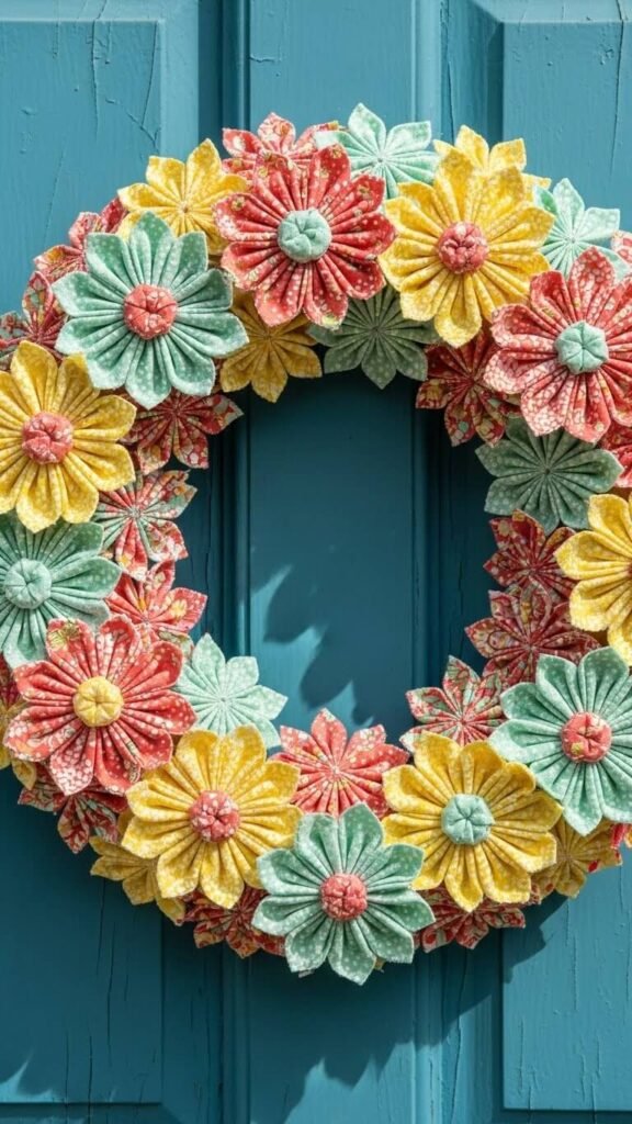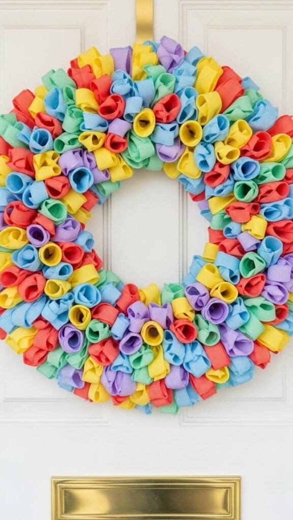 Kids can help make this one. Tie 100+ ribbon loops onto a wire wreath frame—no glue needed. Mix spring pastels or go bold with primary colors. The fluffier you tie each loop, the fuller it looks. Use 1-inch wide ribbon and cut 6-inch strips. Fabric stores sell ribbon remnants cheap. This takes 90 minutes and looks expensive. Great for playrooms or classroom doors.