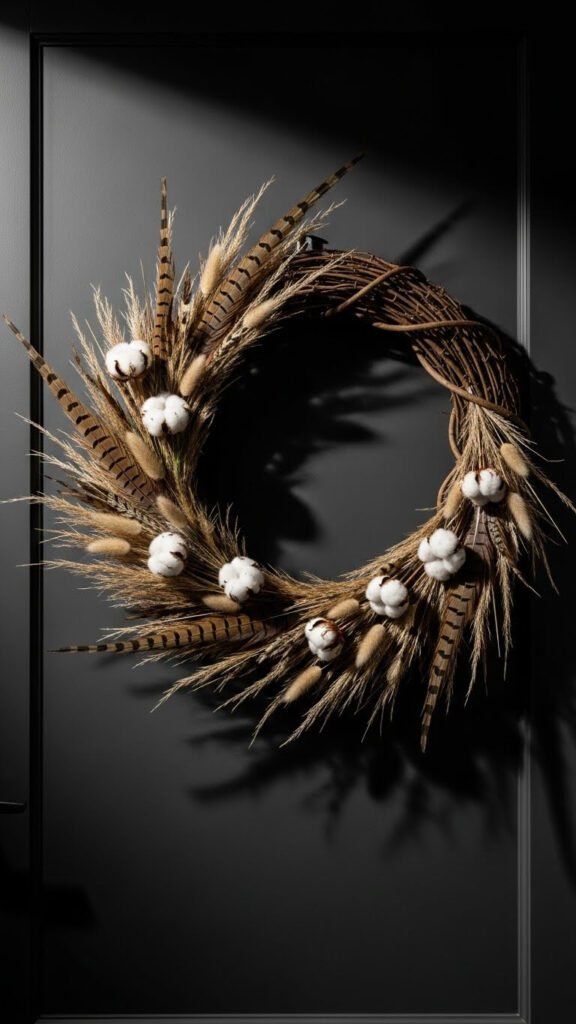 Go boho with foraged twigs and craft store feathers. Bend flexible twigs into a circle and secure with wire. Tuck feathers between twigs at varying angles. Add dried grasses for softness. This costs under $10 and looks expensive. Perfect for nature lovers or Southwestern aesthetics.