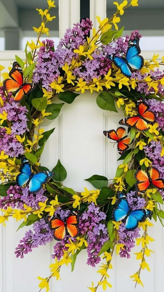 Add movement with faux butterflies. Build a floral base with lilacs, forsythia, or other spring blooms, then wire butterflies throughout. They create the illusion of motion and delight kids. Costs $15-20 including butterflies from the dollar store. This cheerful design suits family homes and gardens.