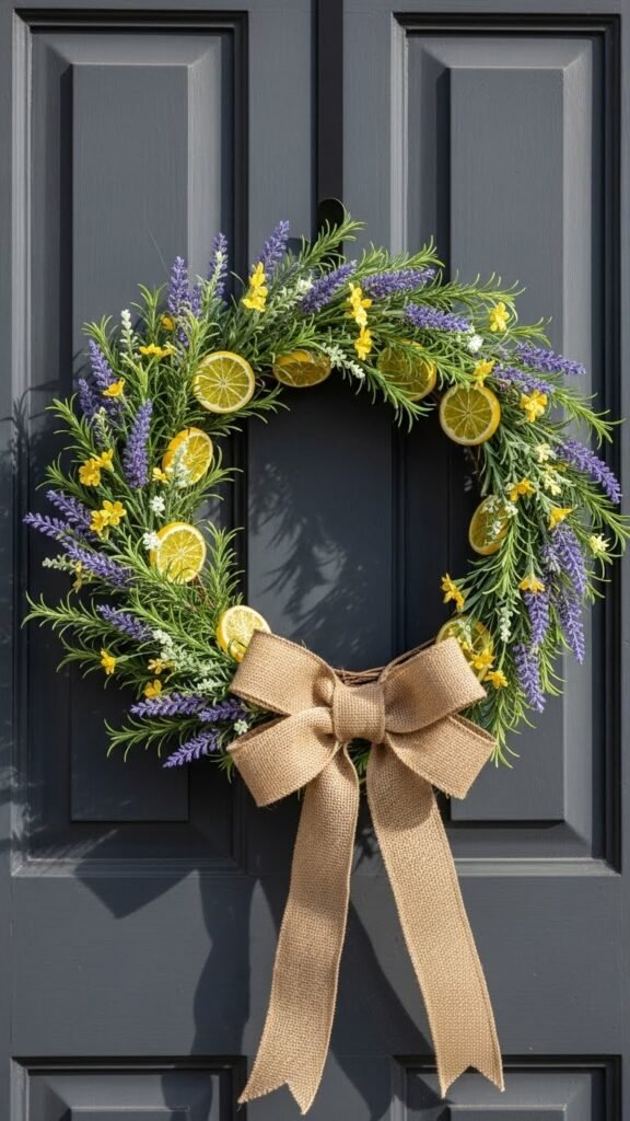 Bring the farmer’s market vibe home with faux lemons and dried herbs. Hot glue lemon slices (real or foam) around a straw wreath, then tuck in rosemary and lavender bundles. The citrus pops against green herbs and smells amazing if you use real sprigs. Refresh the herbs every few weeks by tucking new stems into the base. Dollar store finds keep this under $15. Perfect for kitchen-adjacent doors or cottage aesthetics.