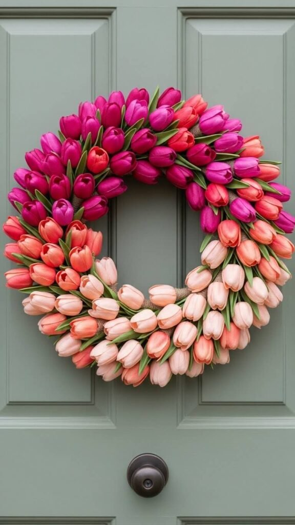 Tulips bloom fast and fade faster, but faux versions stay perfect. Arrange them in color order—dark to light—for an ombre effect that photographs beautifully. Use a foam wreath base and insert stems at angles so blooms overlap slightly. This technique hides the base without extra filler. Choose 30-40 stems in 3-4 shades. Michaels and Joann run constant sales on tulip bunches. Finish in under an hour.