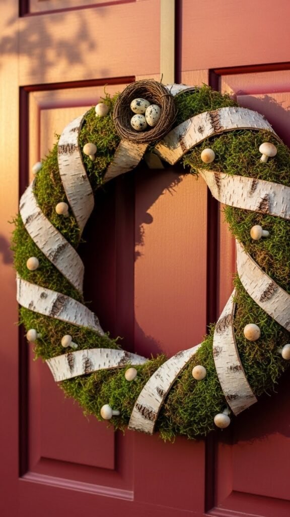 Skip the flowers entirely for a forest-floor look. Wrap birch bark strips around a wire frame, securing with floral wire. Fill gaps with sheet moss (comes in bags at garden centers). Add a faux bird nest or pinecones for texture. This wreath transitions from spring to summer easily and costs almost nothing if you forage bark and moss yourself. Otherwise, expect $10-12 in materials.