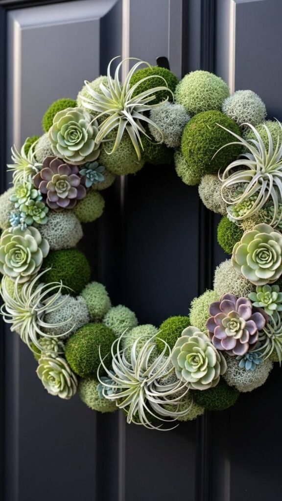 Succulents give you that trendy minimalist vibe. Hot glue faux succulents and moss balls to a flat wood or wire base. Leave breathing room—overcrowding kills the modern look. Real succulents work too if your door gets indirect light and you mist weekly. Check dollar stores for small succulent picks. This style suits contemporary homes and stays fresh-looking for months.