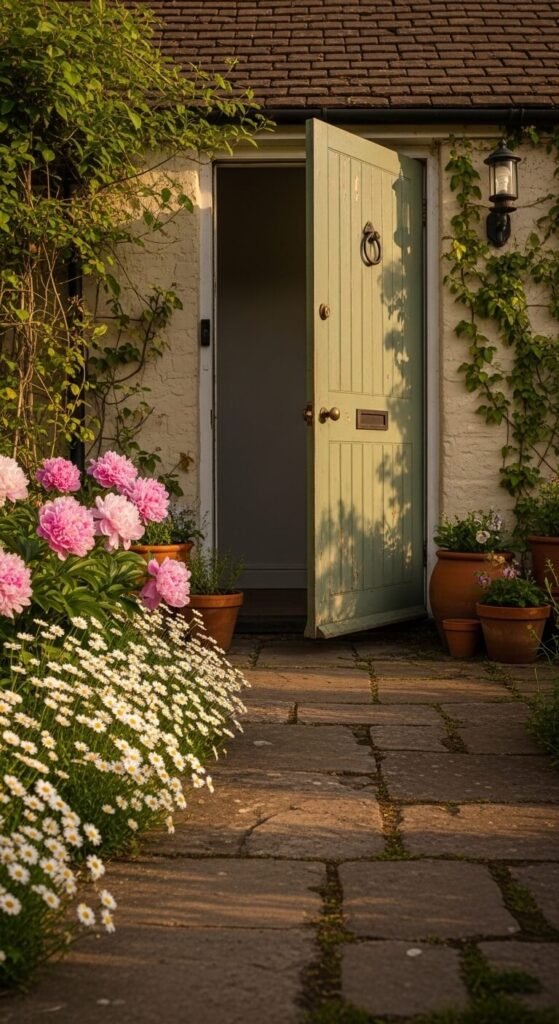 A painted front door is the quickest curb appeal upgrade you can make. Sage green, dusty blue, or warm terracotta feel right at home on a cottage exterior.