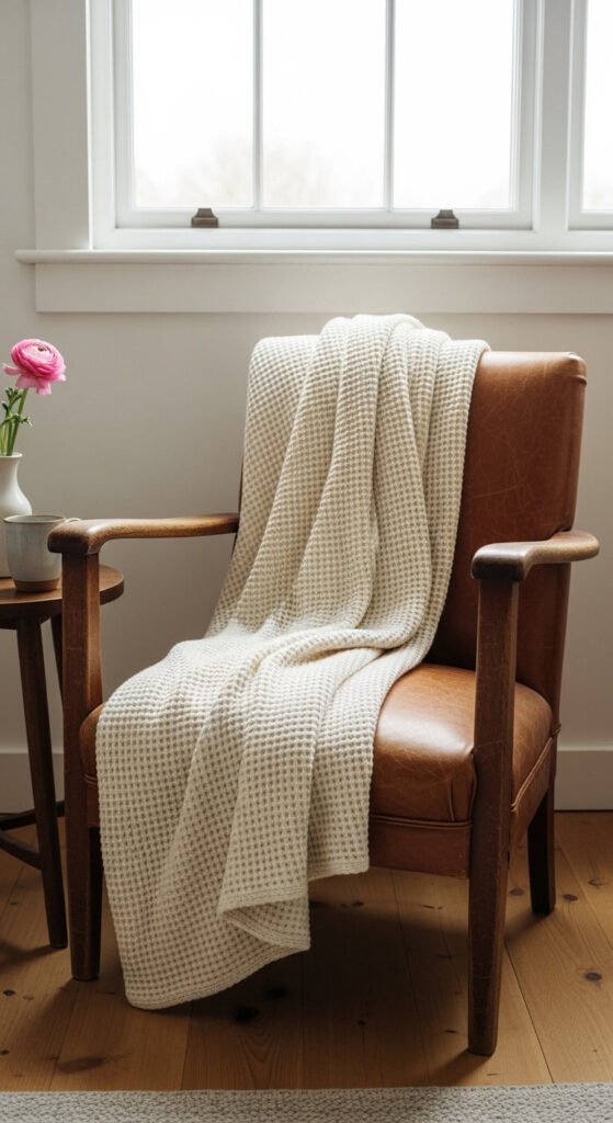 Drape one casually over the arm of a sofa or the back of a reading chair. Don’t fold it neatly — a slightly tossed look feels more lived-in and inviting. Brands like Coyuchi and Parachute make beautiful ones, but Amazon basics work just as well.