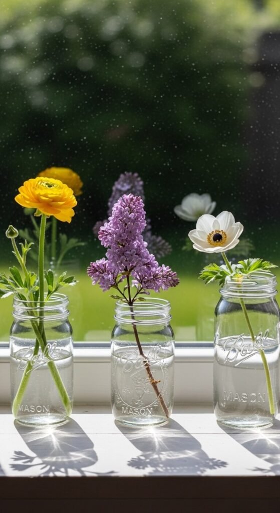 You don’t need fancy vessels to display spring flowers beautifully. Mason jars, old jam jars, and small glass bottles make charming bud vases.