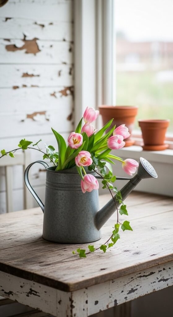 Fill it with tulips, ranunculus, or wildflowers. Set it on a kitchen table, porch step, or entryway console. It takes under two minutes to style and always draws a comment from guests. Cottage charm in its purest form.