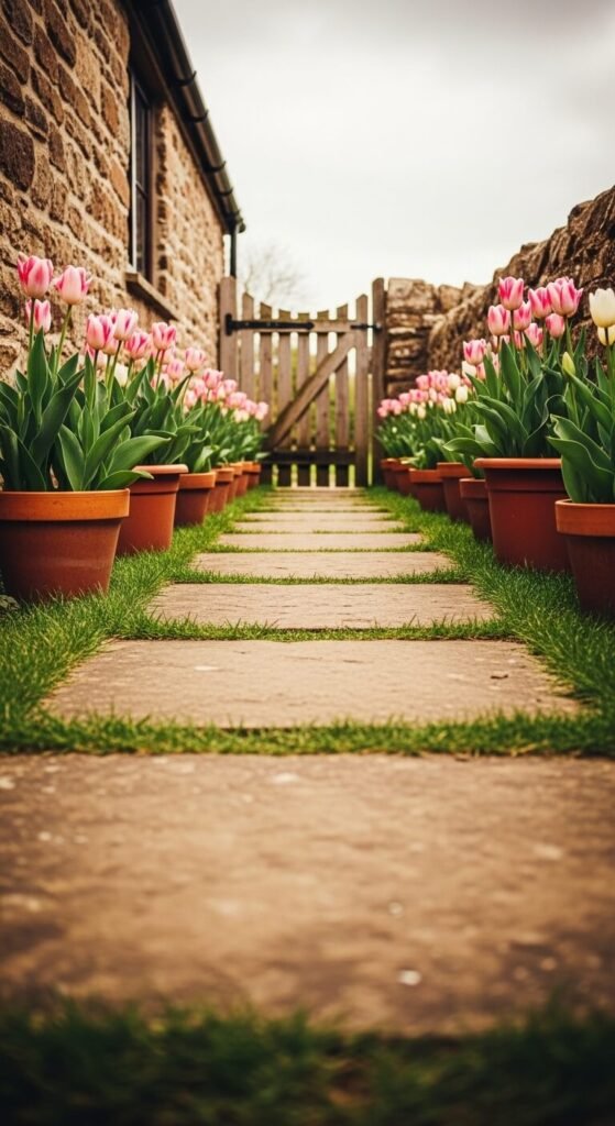 Space them evenly along the path, alternating heights if you like. A single color (all white or all pink) looks elegant. A mix of soft pastels feels playful and abundant. After they bloom, plant the bulbs in the ground for next year’s display.