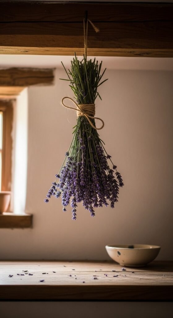 Pick up a small pot from a garden center or a few bunches from a farmer’s market. Hang them in bundles from a beam, curtain rod, or hook in the kitchen or bedroom.