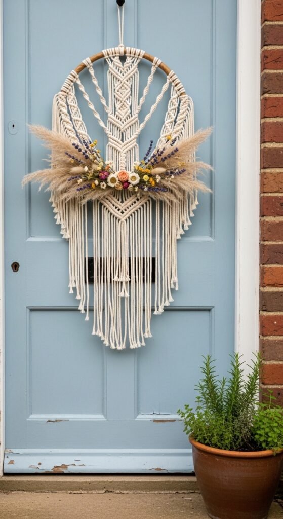 A macramé wreath feels more personal than a store-bought option and fits the cottage aesthetic perfectly.