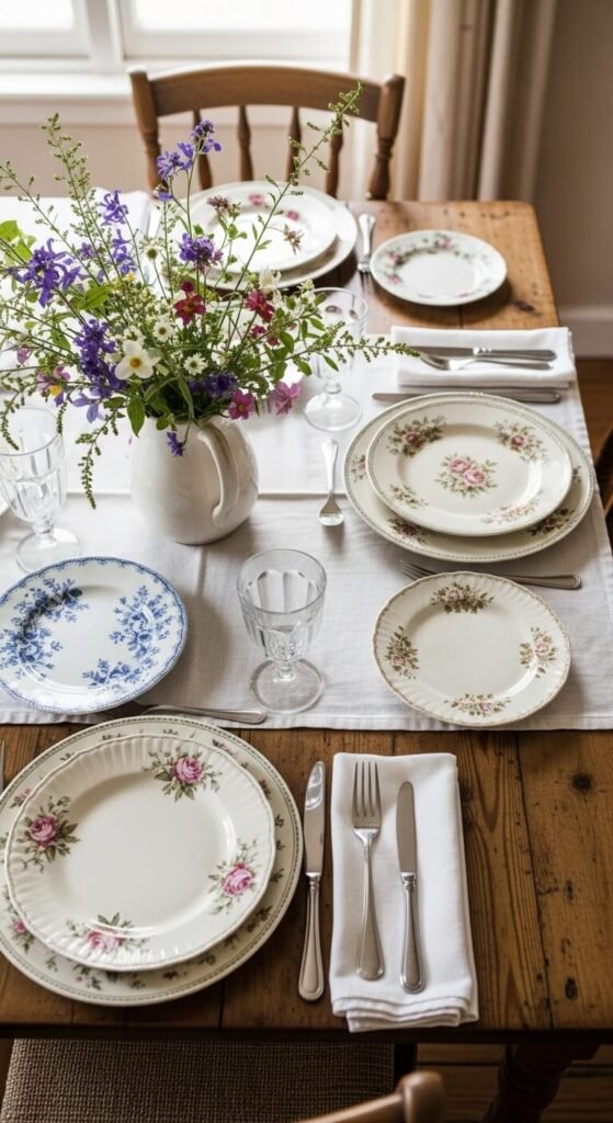 The key is keeping linens simple and uniform — all white napkins, a plain tablecloth — so the china takes center stage. A pitcher of loose wildflowers in the center ties everything together. This table style is warm, personal, and costs very little.