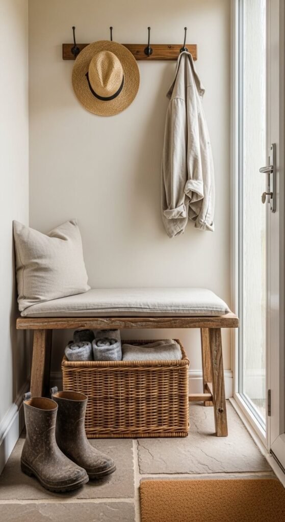 Style it with a linen cushion on top and a wicker basket beneath for blankets or bags. Add a hook above it for hats and light jackets. Welcoming without being overdone.