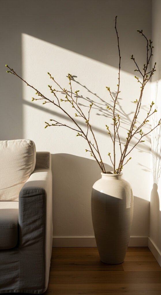 Empty corners often go unused or collect clutter. A tall vase with branches gives the space a sense of height and life without taking up floor space.