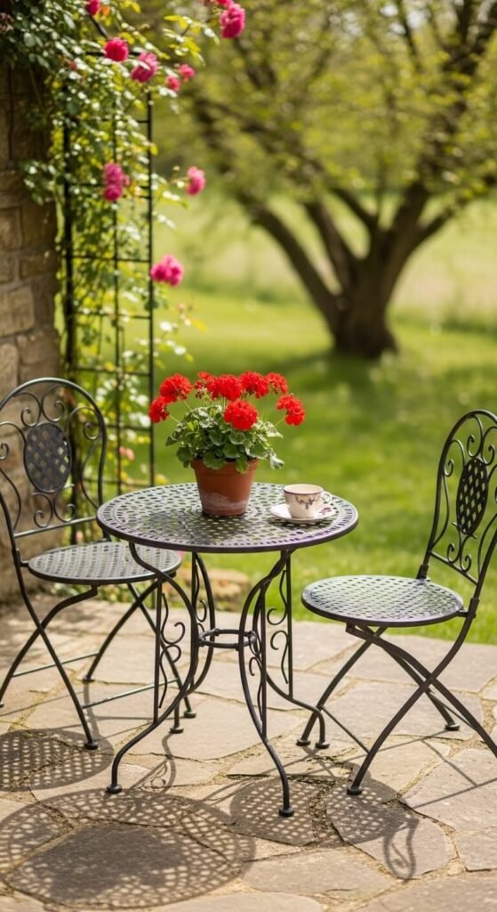 Add a small potted geranium on the table and a candle for evenings. This becomes your morning coffee spot, your evening wine spot, your everything spot.