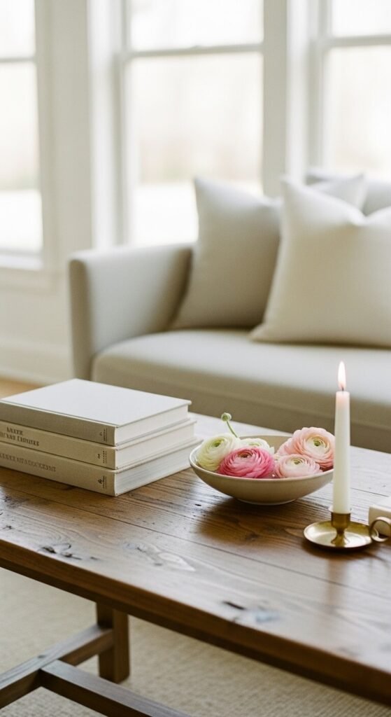 The rule of three works well here: one tall element (candle or small vase), one flat element (books or tray), and one organic element (a small bowl of flowers or a trailing vine).