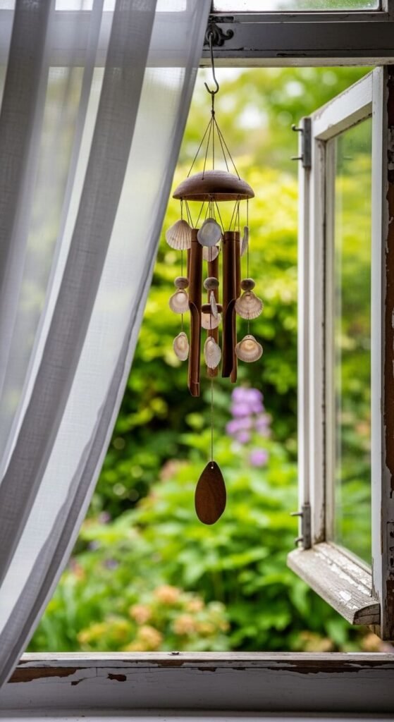 Wooden or bamboo chimes have a gentler, more organic tone than metal ones. Driftwood and shell styles feel especially at home in a cottage setting.