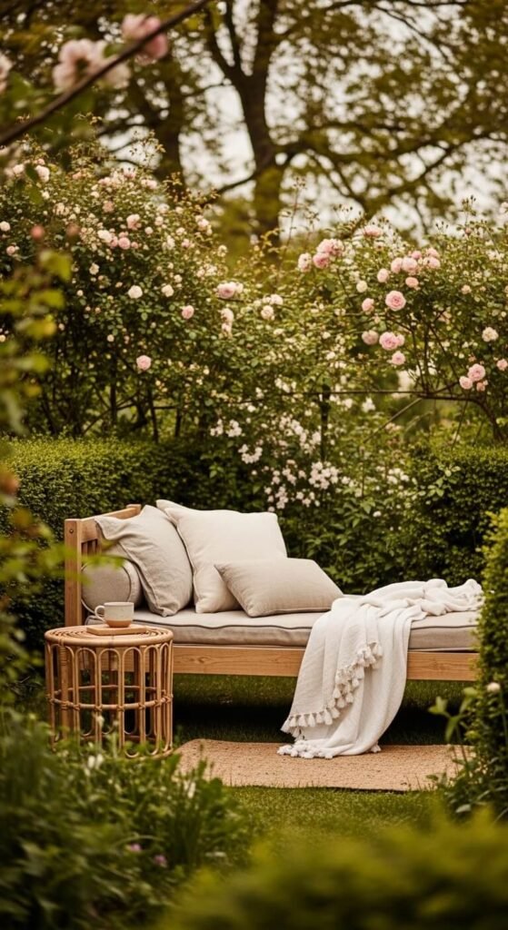 A low bench or garden daybed with a waterproof cushion and a light throw is enough. Place it somewhere sheltered — under a tree, against a hedge, or in a garden corner that gets morning sun.