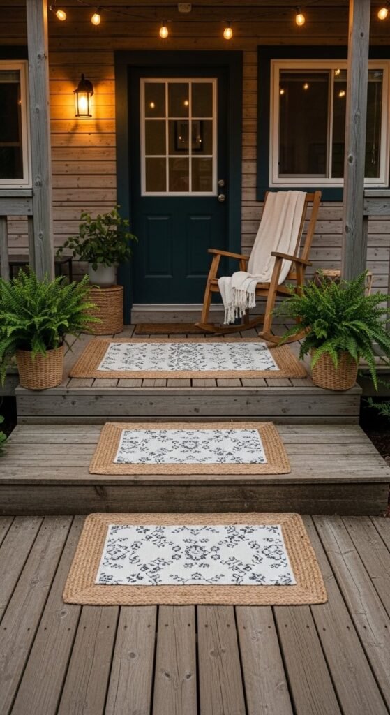 Target and Amazon both carry outdoor rugs under $40. The layered look makes the whole porch feel like an outdoor room.