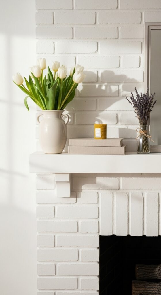 Start with a tall vase of tulips or branches. Add a smaller candle beside it. Stack two or three books with linen or neutral spines. Tuck in a sprig of dried lavender or a small framed botanical print.