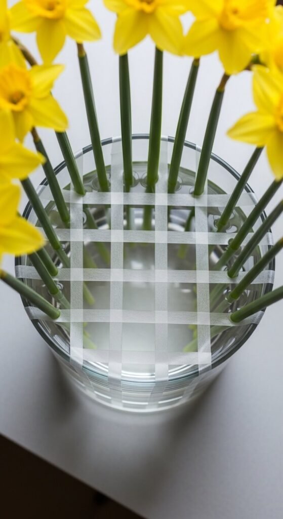 If you’re using a wider vessel and want your daffodils perfectly upright, a little hidden structure goes a long way.