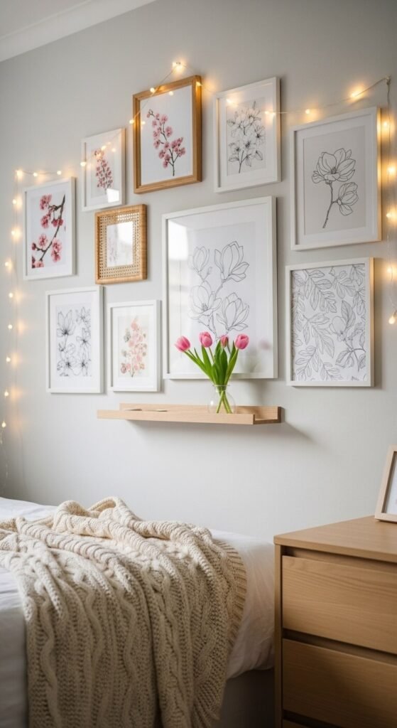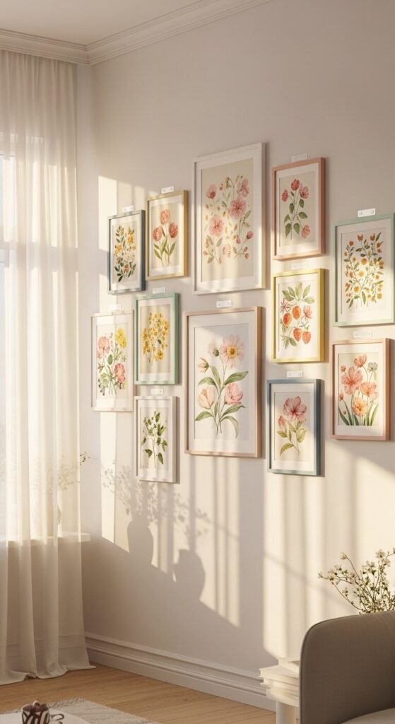 Stick to two or three dominant colors and let your prints do the storytelling. You can mix photography, watercolor illustrations, typography, and pressed flower art — as long as the palette stays consistent, it will feel intentional.