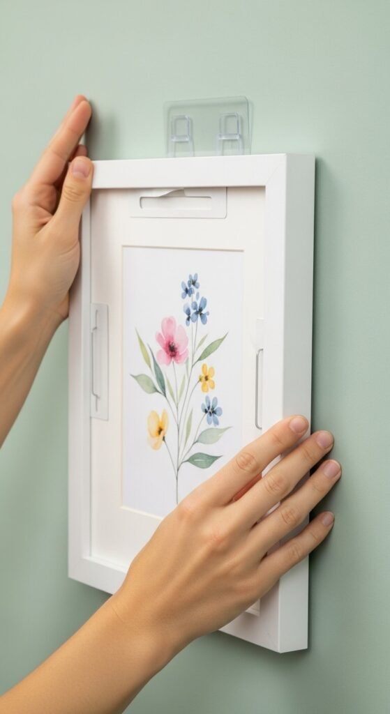 Now comes the satisfying part. Command picture-hanging strips are the gold standard for hole-free hanging — they hold surprisingly well and remove cleanly when you’re ready for a change.