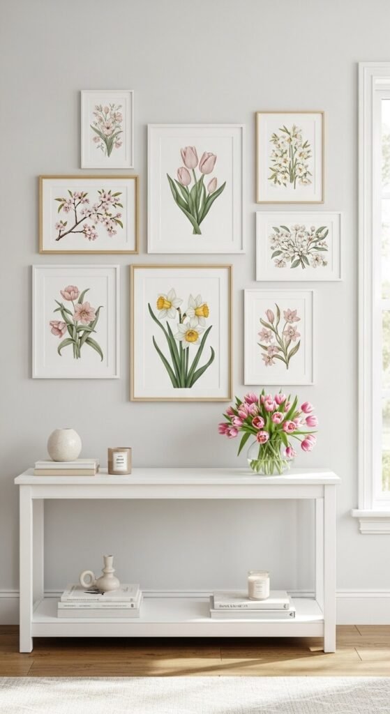 For spring, try a loose cluster of 3–5 frames in different sizes rather than a perfectly symmetrical grid — it feels more relaxed and seasonal.