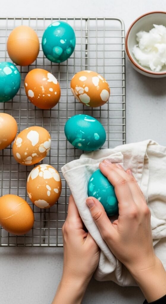 Once your eggs are perfectly dyed, remove them and pat dry with paper towels. For extra shine and a professional finish, rub each egg with a tiny bit of coconut oil or vegetable oil using a paper towel. This creates a beautiful glossy sheen that makes colors pop even more.