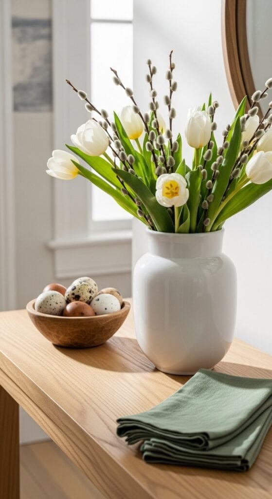 - Incorporate one subtle Easter element (a ceramic bunny in white, a nest with eggs)