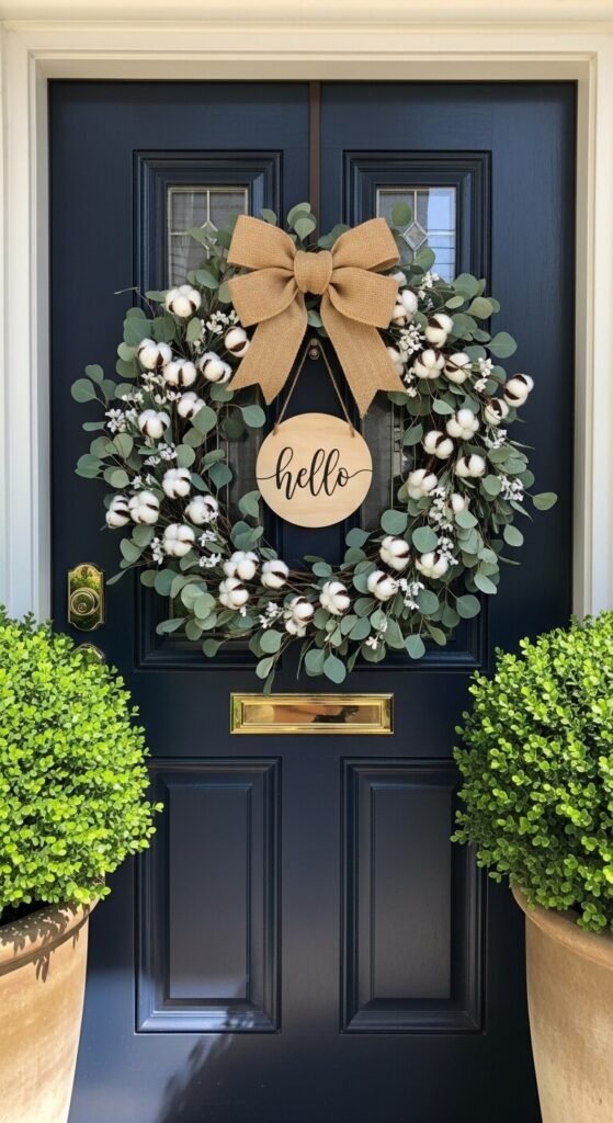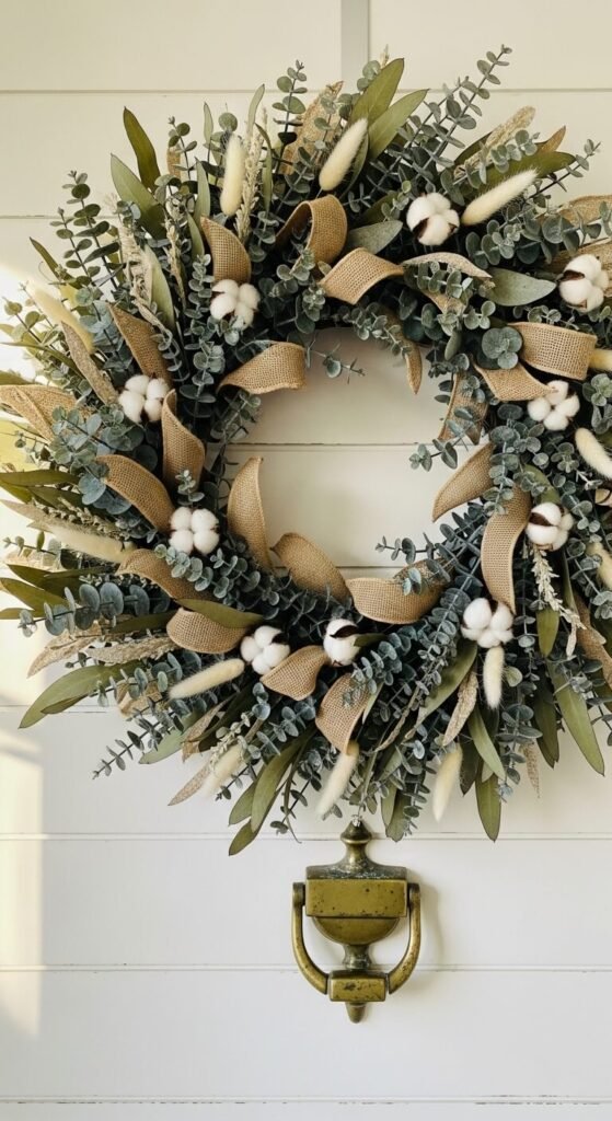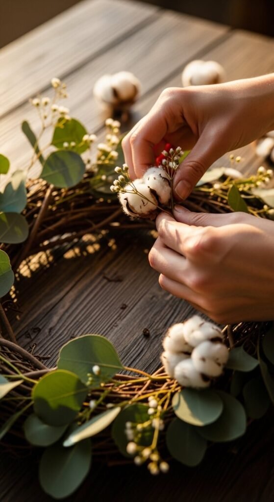 Cotton stems are an absolute farmhouse staple. Tuck 3–5 stems in clusters rather than spreading them out evenly. Grouping creates visual weight and makes the wreath look intentional rather than scattered.