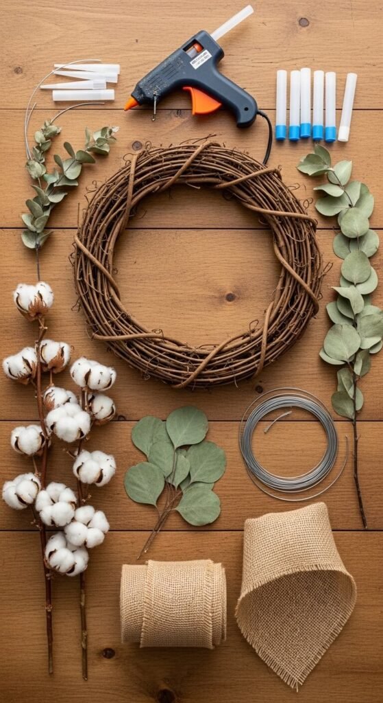 A grapevine base is ideal for farmhouse style — it already has that naturally imperfect, organic texture that gives your wreath instant rustic character.