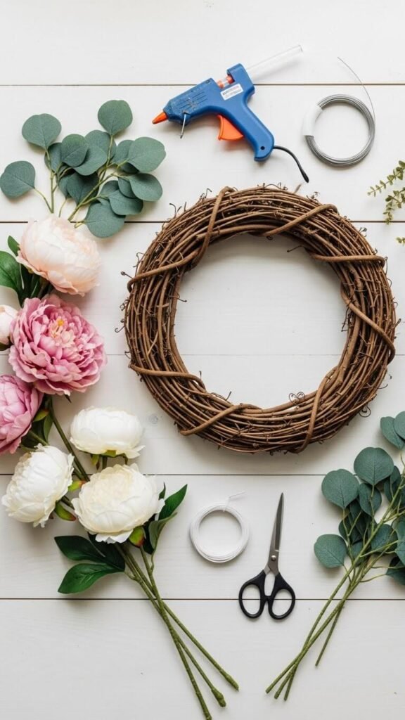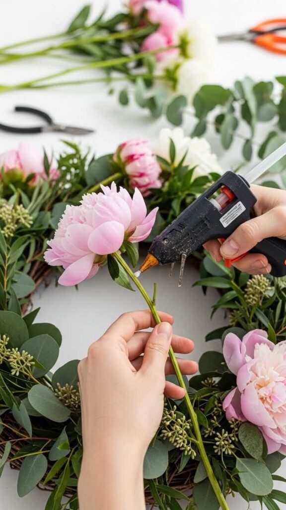 Layer different types of greenery for depth and texture. Don’t worry about making it perfect—spring is all about that wild, garden-fresh look! Aim to cover about 60-70% of your wreath base, leaving some of that beautiful grapevine texture peeking through.