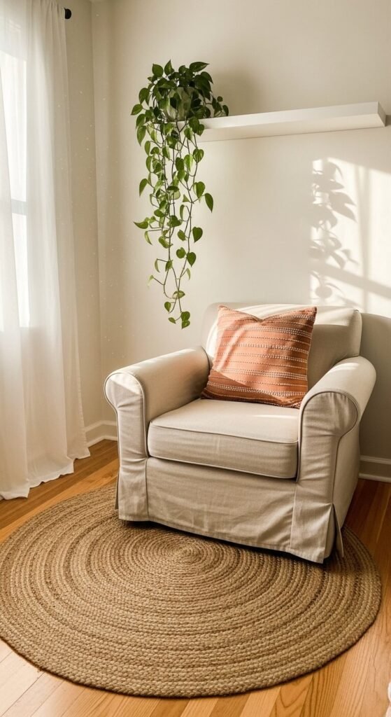 - Add a potted plant like a peace lily or snake plant — both improve air quality and add life to the room